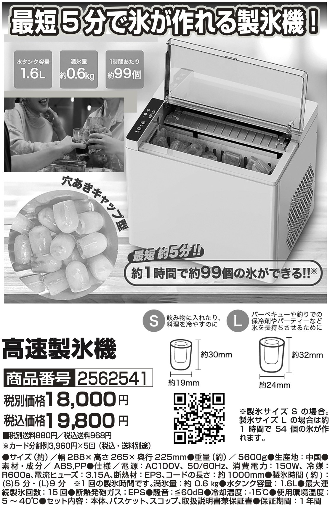 ●製氷時間(約):(S)5分・(L)9分※1回の製氷時間です。満氷量:約0.6kg