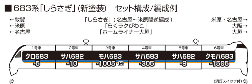 クモハ683は消灯スイッチ付5スロットレスモーターの採用で、スムースかつ静粛な走行性を実現6行先表示シールを付属7貫通先頭車先頭連結部はKATOカプラー密連形(フックなし)採用(電連付属)。