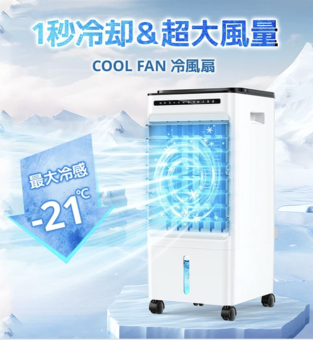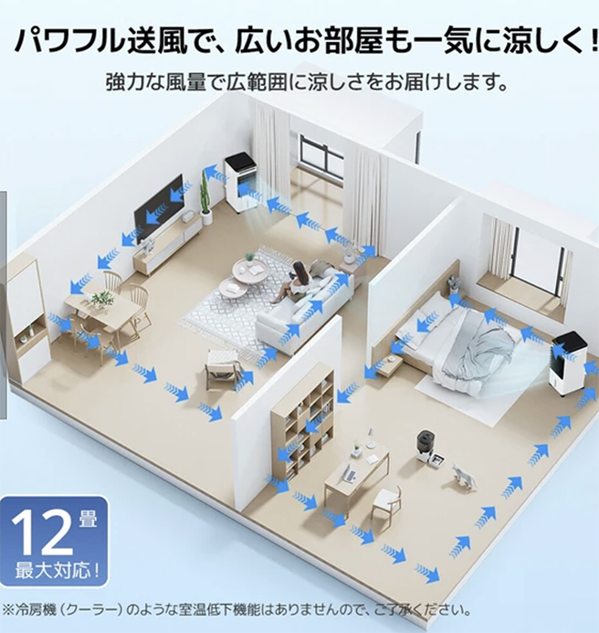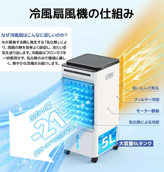 すばやく冷やす1秒冷却・超大風量をはじめ、マイナスイオン発生、冷気循環、入切タイマー、3段階風量調節、自動首振り...と、快適な機能を満載した使いやすい冷風扇です。