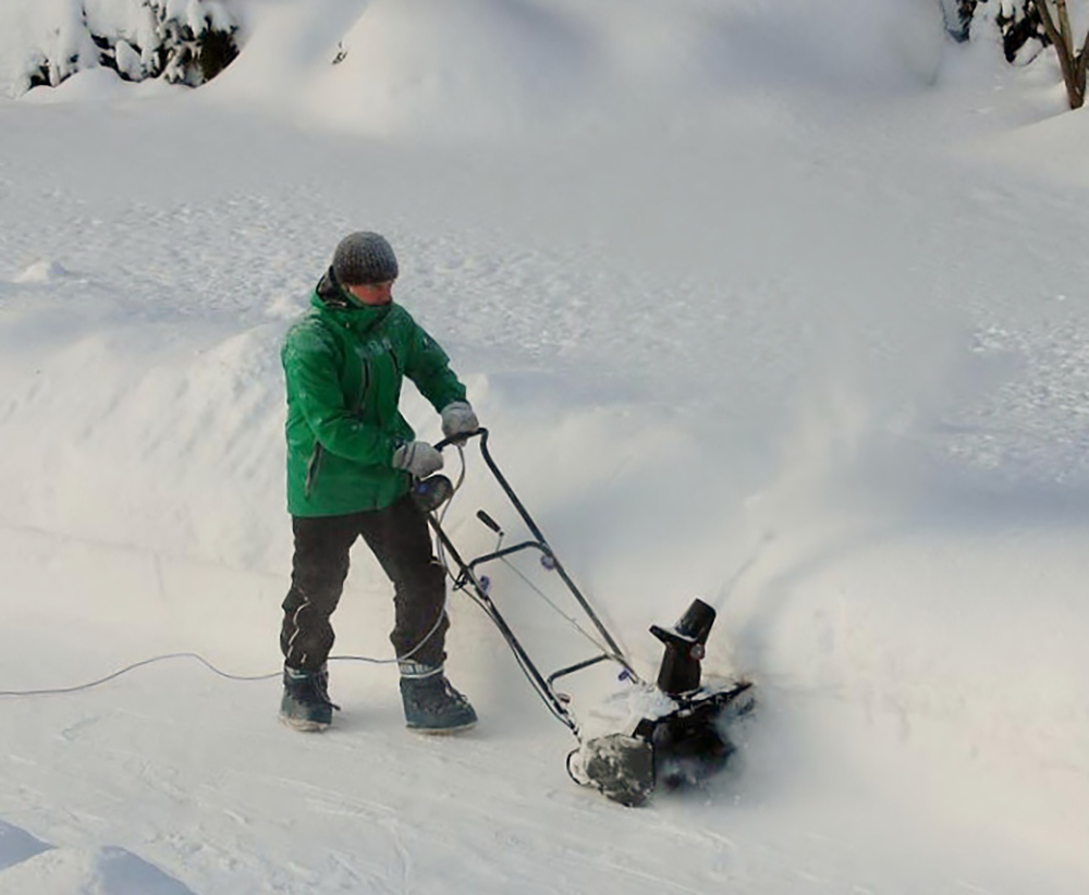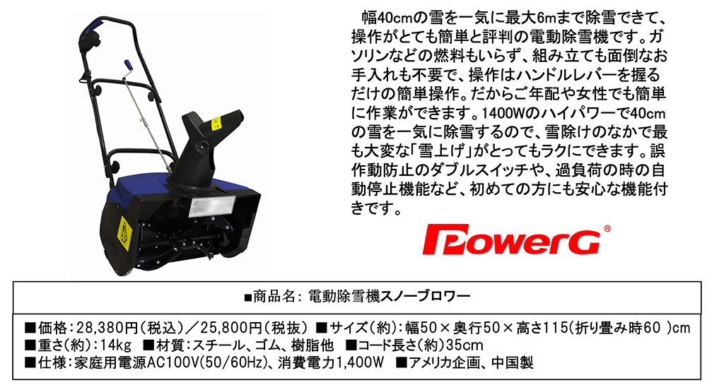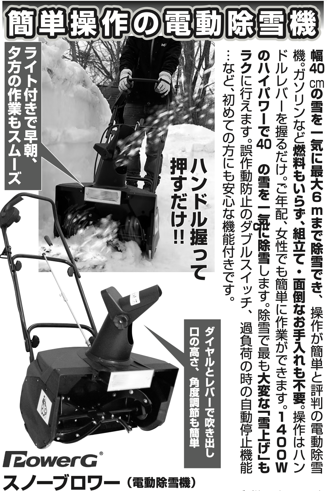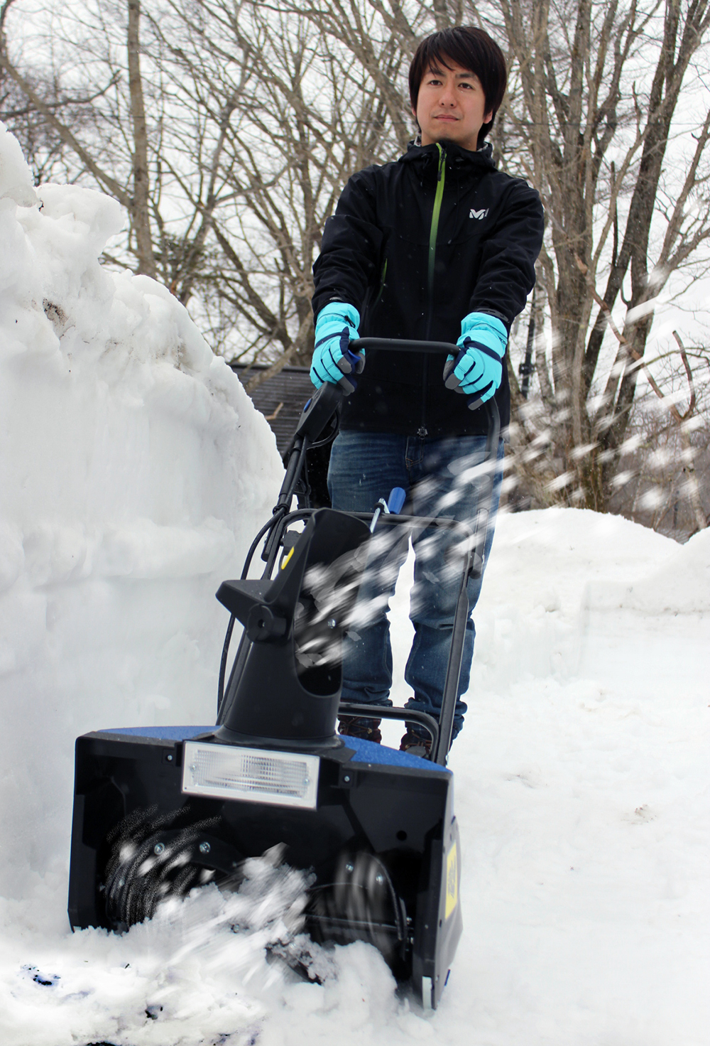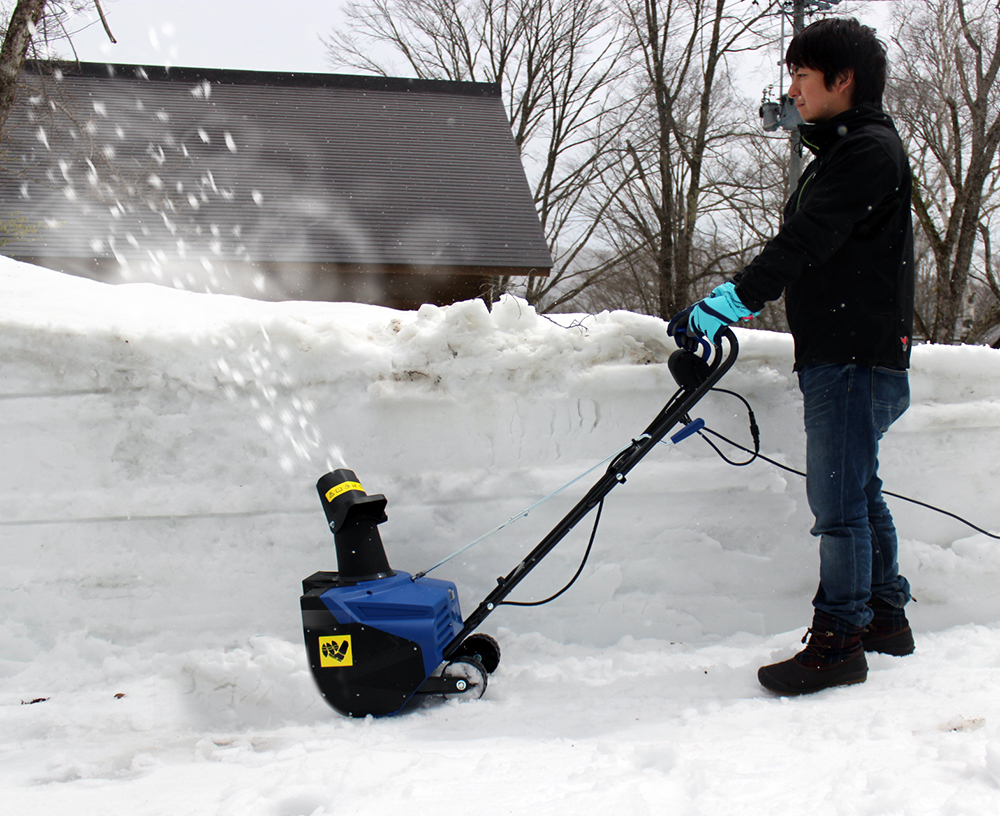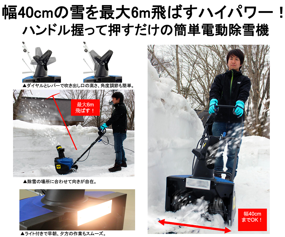 幅40の雪を一気に最大6mまで除雪でき、操作が簡単と評判の電動除雪機。