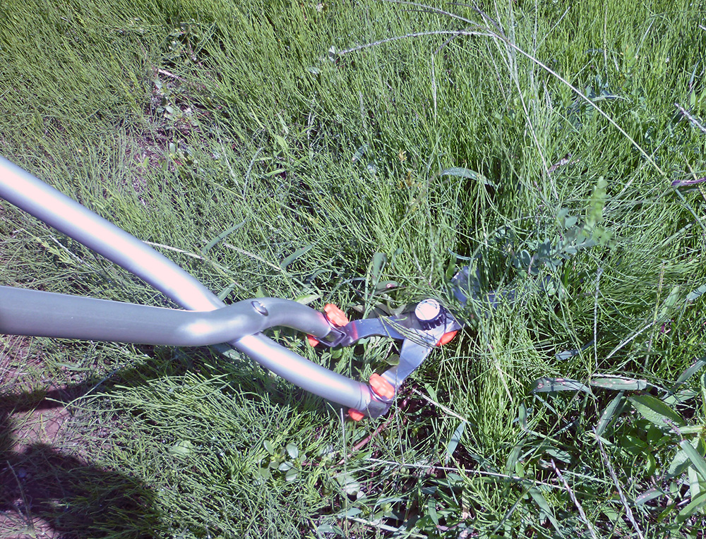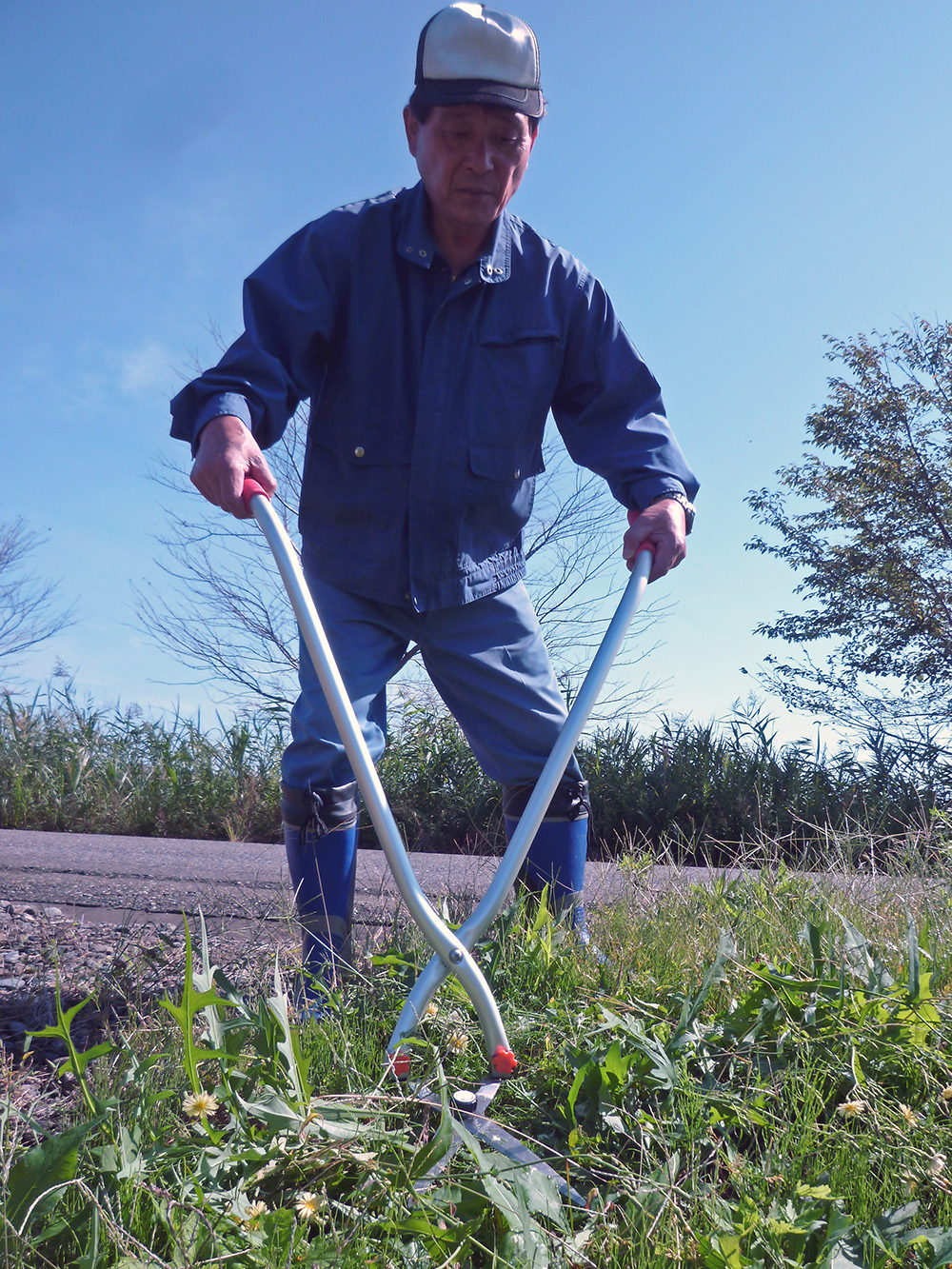 パイプと刃に角度が付いているので、かがまずに草を刈り込めます。