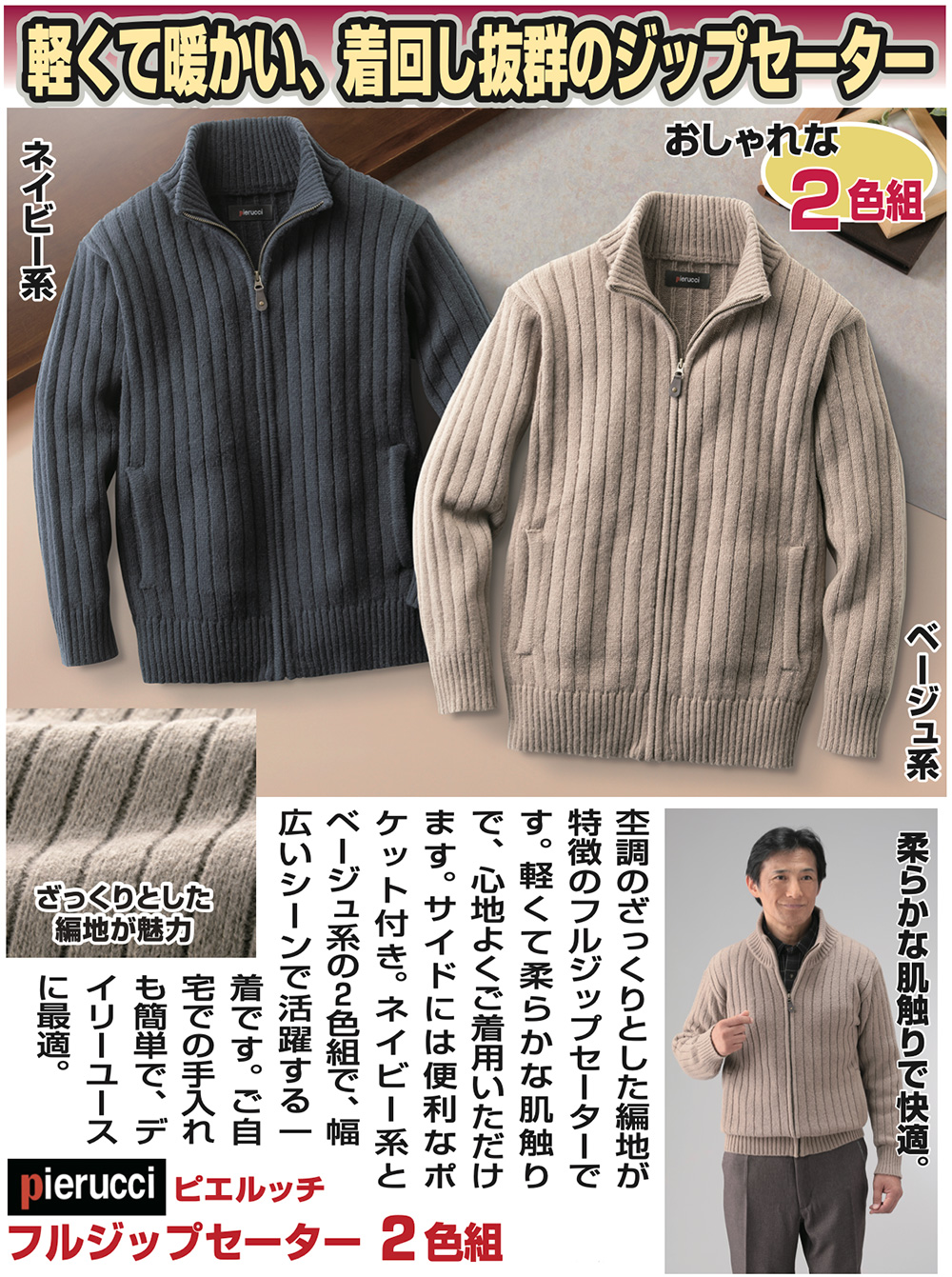 ネイビー系とベージュ系の2色組で、幅広いシーンで活躍する一着です。