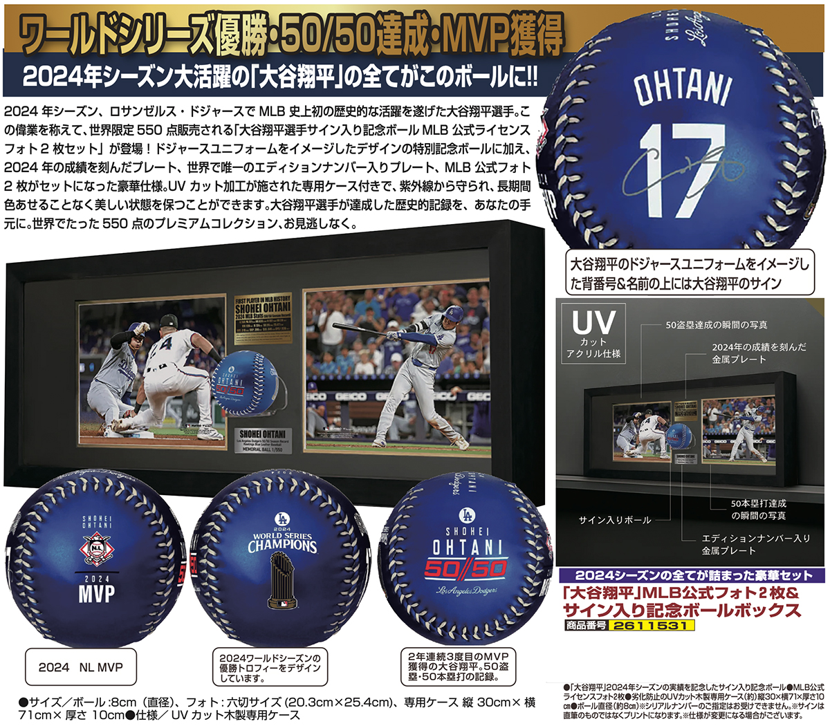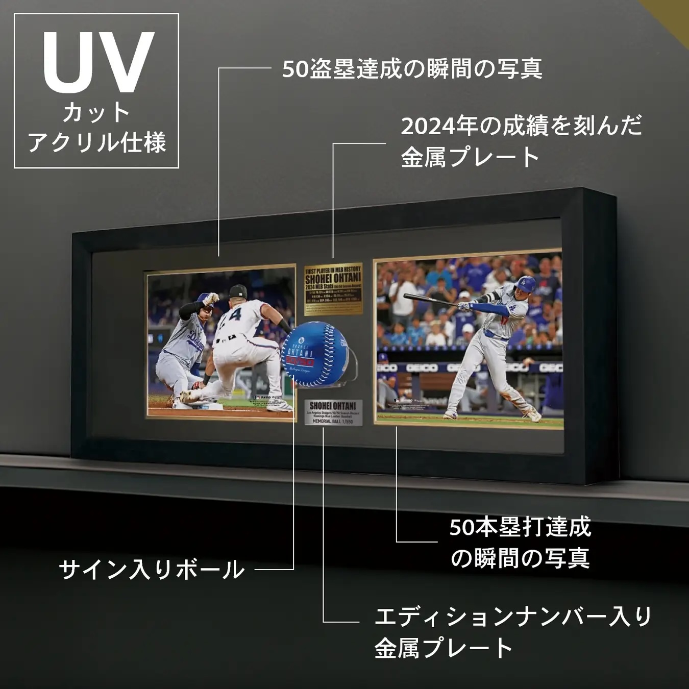 ドジャースユニフォームをイメージしたデザインの特別記念ボールに加え、2024年の成績を刻んだプレート、世界で唯一のエディションナンバー入りプレート、MLB公式フォト2枚がセットになった豪華仕様。