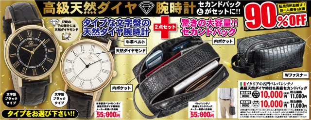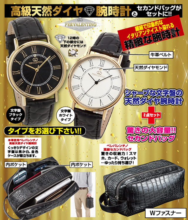 イタリアの名門ペレバレンチノ 高級天然ダイヤ時計&Wファスナーセカンドバッグ